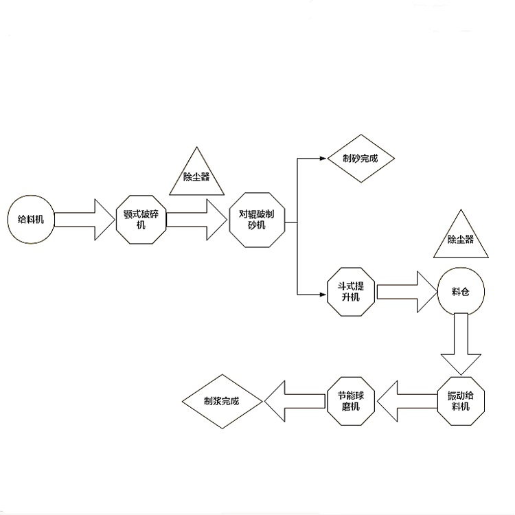 近日來自山東泰安的李總需要購買煤矸石制砂制漿設(shè)備聯(lián)系到我們,根據(jù)他的需求我們?yōu)樗O(shè)計(jì)了方案。我們了解到李總的煤矸石原料為200mm,要求產(chǎn)量達(dá)到100噸,經(jīng)過具體分析我們?cè)O(shè)計(jì)了方案,需要使用到的設(shè)備有給料倉、對(duì)輥制砂機(jī)、斗式提升機(jī)、料倉、振動(dòng)給料機(jī)、節(jié)能球磨機(jī)各一臺(tái),顎式破碎設(shè)備和除塵器各兩臺(tái),具體工藝流程如下: